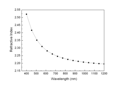Ti3O5 Crystal Evaporation Material Size: 1-3mm,3-6mm granule Basic Properties: Refractive Index (550nm) : 2.35 Color : Purple Purity :99.9% Melting Point : 1760ºC Density : 4.60g/cm3 Evaporation Temperature :1800-2000°C Optical Properties: Evaporation conditions: K9 glass substrate; substrate temperature 250°C , oxygen partial pressure 1.7×10-2Pa, deposition rate 0.5 nm/s